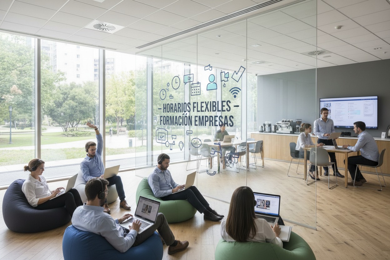Clases en la empresa, online o híbridas, adaptadas a la disponibilidad de los empleados.